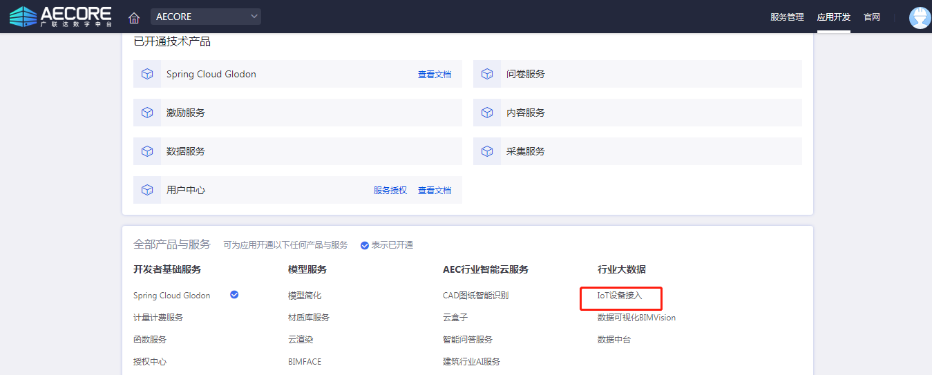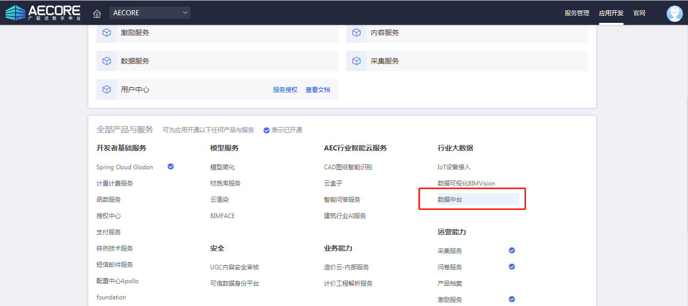 step1:登录AECORE,创建应用,开通太阳成tyc7111cc数据中台服务;