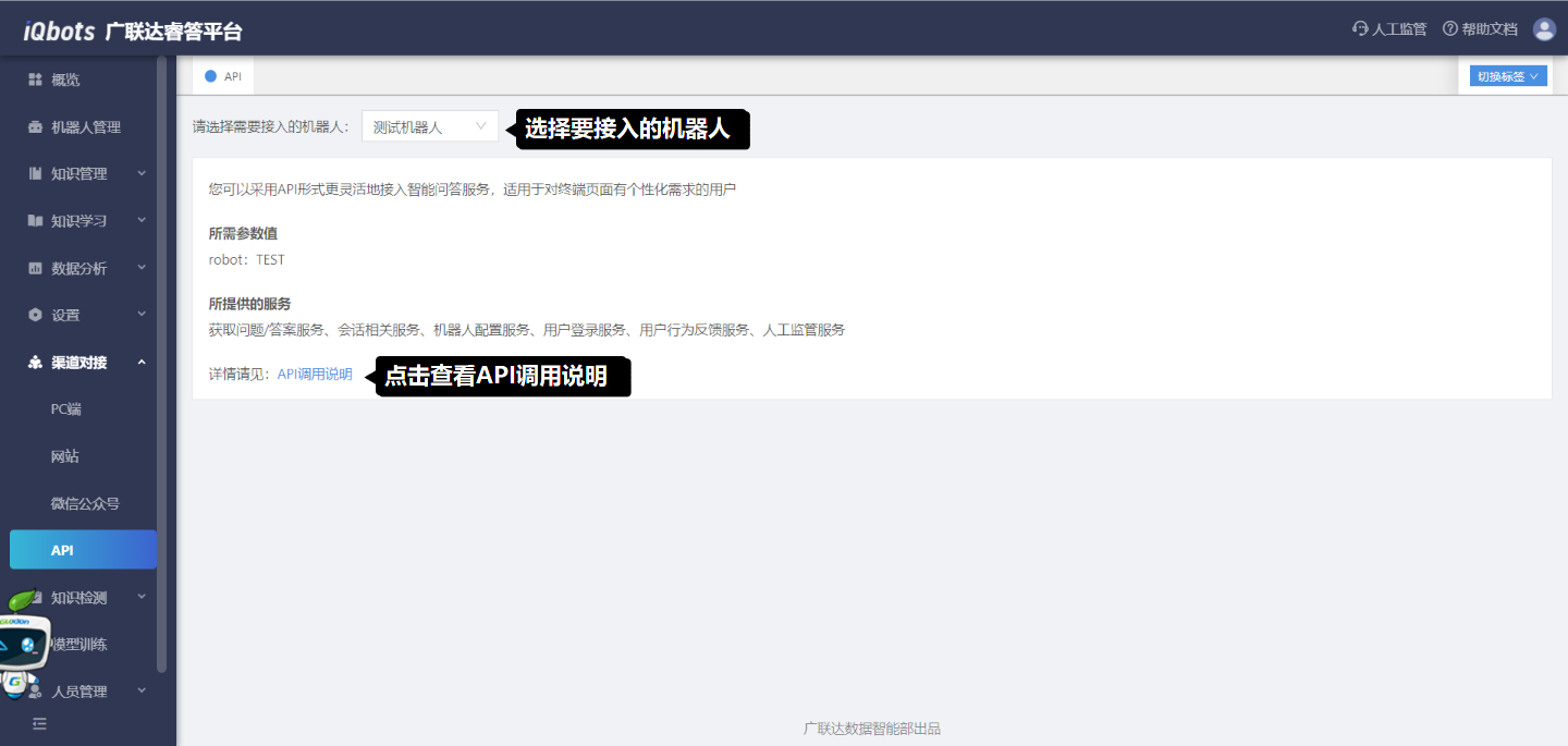 接入步骤:(1)选择需要接入的机器人;(2)单击【API使用文档】,根据文档提示完成机器人的接入。