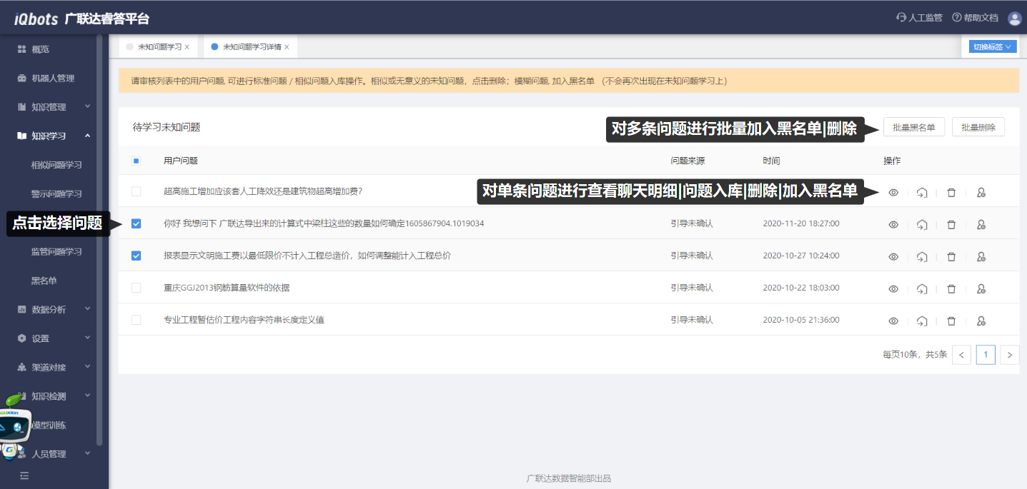 未知问题学习模块是机器人无法判断并回答出来的问题,或用户对机器人再次引导的问题无点击行为的问题汇总。用于收集机器人回答不上的用户问法,为知识库丰富新知识。