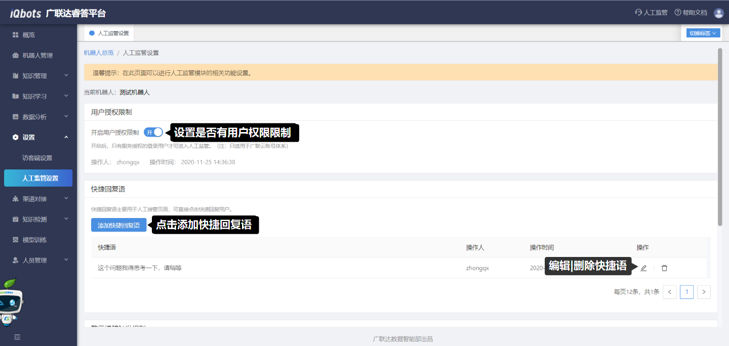 用于设置快捷回复语和警示提醒触发规则,若用户触发了设置好的警示规则,则人工监管相应会话会显示重点提醒标识;同时在人工接管页面中人工客服可以直接点击配置好的快捷回复语回复用户。