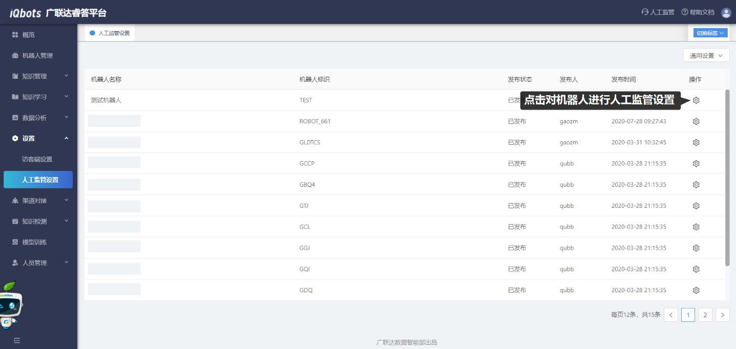 点击首页中右上角的“人工监管”图标,可以进入相应的人工监管服务页面。在人工监管页面中,可以选择需监控的机器人,并看到智能聊天的会话。在机器人回答效果不好时,主动接管会话进入人工服务后,可有效及时地解决用户问题,提升用户体验。