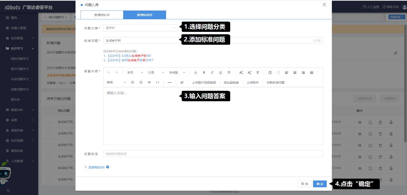 (2)输入标准问法,此时系统会对知识库内已存在的类似问题进行检索,如有相同/相似问题会给出提示;