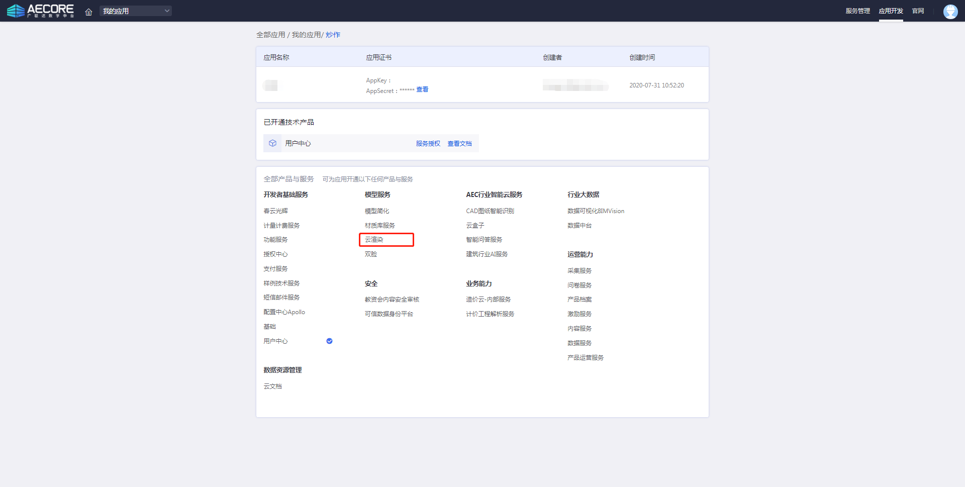 首先需要通过AECORE创建应用,申请开通云渲染服务权限,待审核通过,即可开通云渲染服务。
