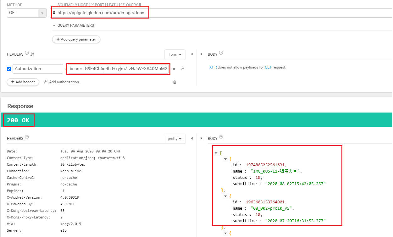 返回参数中的token是一个加密串,调用其他云渲染服务API时,必须将该token值放入http请求的Authorization头。