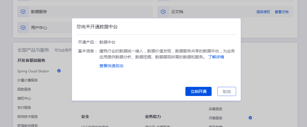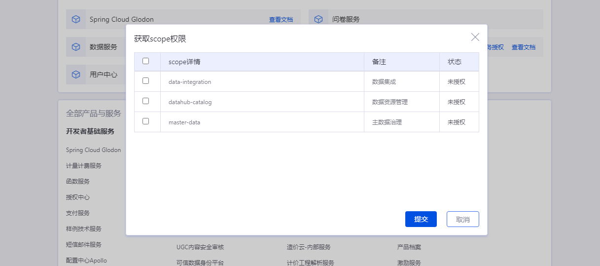 应用创建后选择并开通本服务,申请应用scope,进入数据中台控制台