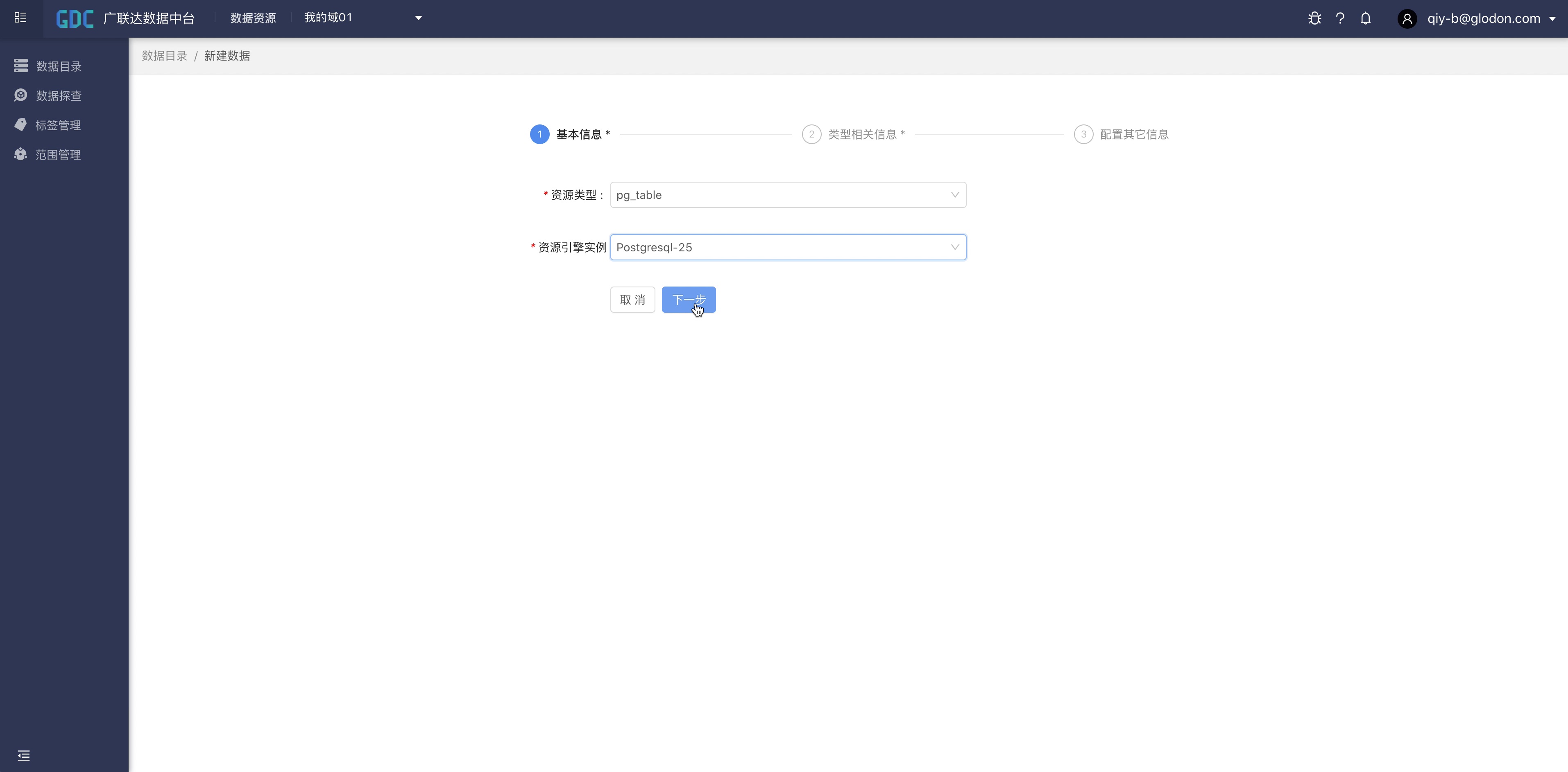 在已创建的域的卡片上点击“数据资源”,进入数据资源模块后,点击上面的“新建数据表”。首先选择要创建的资源的类型,以及存储的引擎实例。