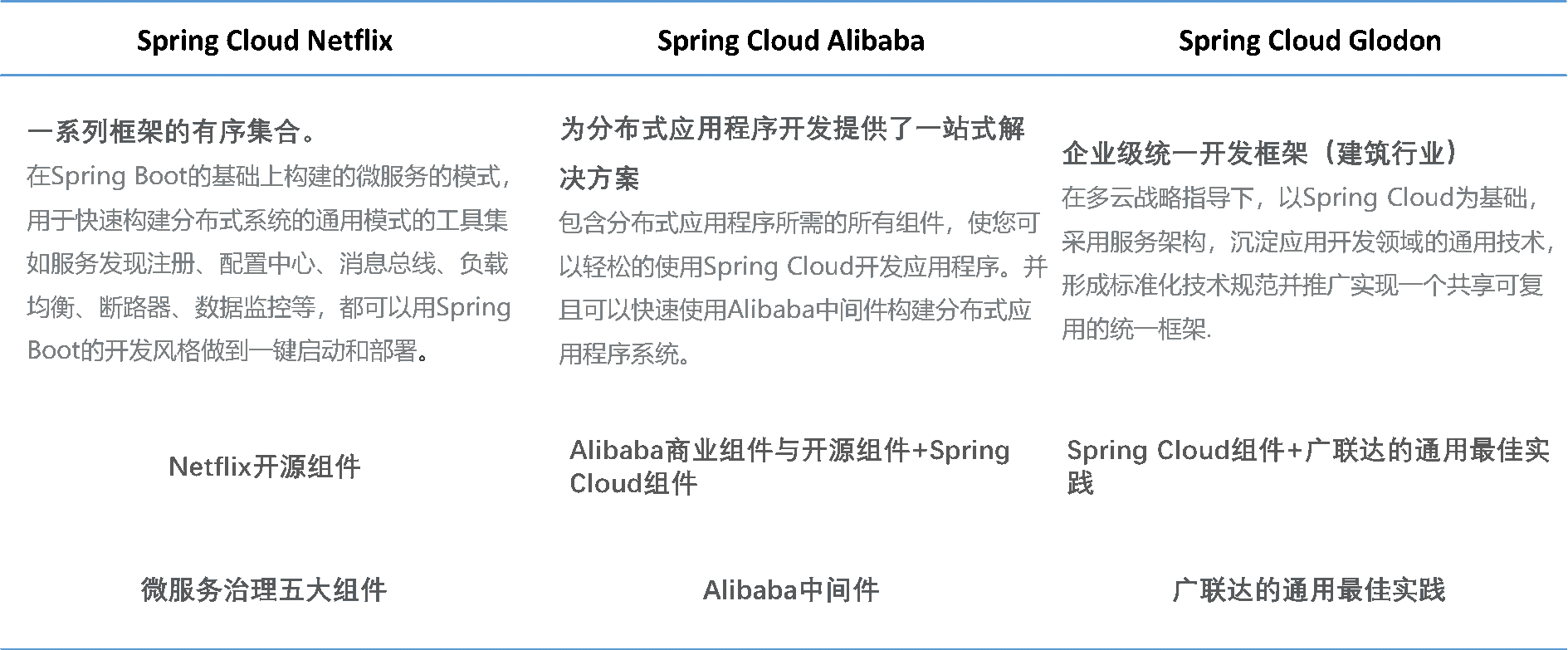 从上表可以看出,Spring Cloud Netflix 与Spring Cloud Alibaba是以微服务治理为核心的分布式应用程序开发解决方案,主要内容包括服务注册发现、服务网关、配置中心、服务链路追踪等组件。而Spring Cloud Glodon是以太阳成tyc7111cc通用最佳实践为核心的企业级开发框架,主要内容Spring Cloud组件、太阳成tyc7111cc通用最佳实践。